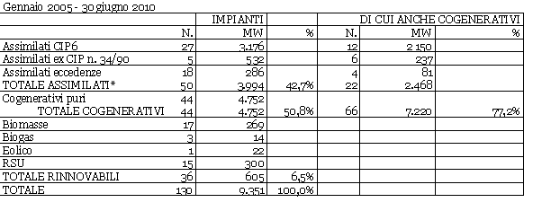 (*)Le fonti energetiche ‘assimilate’ sono risorse di origine fossile; secondo il Cip 6, risultano alimentati da fonti assimilate: gli impianti di cogenerazione, gli impianti che utilizzano calore di recupero e fumi di scarico; gli impianti che utilizzano gli scarti di lavorazione e/o di processo; gli impianti che utilizzano fonti fossili prodotte esclusivamente da giacimenti minori.