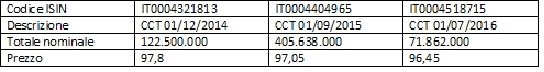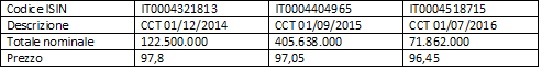 Il Ministero dell’Economia e delle Finanze comunica i risultati dell’emissione del nuovo CCTeu, con scadenza 15 ottobre 2017, godimento 15 ottobre 2010 e cedola semestrale indicizzata all’euribor 6 mesi con uno spread aggiuntivo di 80 punti base. L’emissione, il cui regolamento è stato fissato per il 27 ottobre 2010, è stata conclusa in giornata odierna per un importo complessivo pari a 5,1 miliardi di euro ed un prezzo di emissione pari a 99,789, corrispondente ad un rendimento pari a 83 punti base sull’euribor a 6 mesi. I 5,1 miliardi complessivi si compongono di una tranche di 4,5 miliardi emessa contro contante e di una seconda tranche di 600 milioni di euro emessa in scambio contro vecchi CCT in circolazione precedentemente annunciati. Tutta l’operazione si è svolta mediante sindacato di collocamento composto da 5 lead manager: Banca IMI S.p.A, Commerzbank A.G., HSBC France, Monte dei Paschi di Siena Capital Services Banca per le Imprese S.p.A. e UniCredit Bank A.G. I restanti Specialisti in titoli di Stato hanno svolto il ruolo di co-lead per l’emissione contro contanti. Con riferimento alla tranche emessa contro contante, hanno partecipato all’operazione oltre 160 investitori per una domanda complessiva di circa 5,5 miliardi di euro. Il 40,6% dell’emissione è stato assegnato alle banche, mentre gli asset manager ed i fondi d’investimento si sono aggiudicati il 34% dell’ammontare complessivo. Il 20% è stato collocato presso investitori con un orizzonte di investimento di lungo periodo (fondi pensione e assicurazioni) mentre il 3,1 % è andato a società non finanziarie. Il collocamento del titolo, in linea con le previsioni, è stato caratterizzato da una distribuzione geografica con un’ampia presenza di investitori domestici (circa il 76 per cento). La partecipazione di investitori esteri è stata tuttavia significativa sia per la sua qualità che la sua composizione molto diversificata: la quote più rilevanti sono state assegnate alla Germania e all’Austria (9,2%), al Regno Unito e all’Irlanda (7,1%) e alla Francia (4,4%). Non sono mancati investitori provenienti da altre aree dell’Europa (Svizzera 1,8%) e da fuori Europa (per un quota pari allo 0,7 %). Con riferimento alla tranche emessa in scambio, la domanda è stati pari a circa un miliardo con la partecipazione di 10 investitori. Di seguito i dettagli dei prezzi e dei quantitativi dei CCT riacquistati dagli investitori nell’ambito dello scambio: