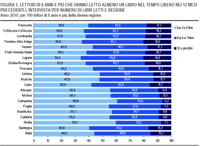 Il 44,3% della popolazione ha dichiarato di aver letto fino a 3 libri nell’ultimo anno, mentre soltanto il 15,1% ne ha letti 12 o più. Nel 2010 il 90,1% delle famiglie dichiara di avere libri in casa: il 62% ne possiede al massimo 100, il 12,2% da 101 a 200 e il 15,9% più di 200. Il 9,6% (pari a 2 milioni e 338 mila famiglie) dichiara di non possedere alcun libro.