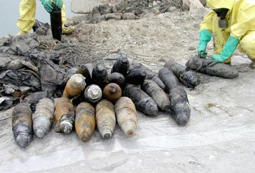 Silenziosi e letali. Sono oltre 30mila gli ordigni inabissati nel sud del mare adriatico, di cui 10mila solo nel porto di Molfetta e di fronte a Torre Gavetone, a nord di Bari; 13mila i proiettili e 438 i barili contenenti pericolose sostanze tossiche inabissati invece nel meraviglioso golfo di Napoli; 4300 le bombe all’iprite e 84 tonnellate di testate all’arsenico nel mare antistante Pesaro. Ci sono poi i laboratori e i depositi di armi chimiche della Chemical City in provincia di Viterbo e l’industria bellica nella Valle del Sacco a Colleferro. Infine sono migliaia le bomblets, piccoli ordigni derivanti dall’apertura delle bombe a grappolo, sganciati dagli aerei Nato sui fondali marini del basso Adriatico durante la guerra in Kosovo. Questi arsenali, prodotti dall’industria bellica italiana dagli anni ‘20 fino alla seconda guerra mondiale e coperti per anni dal Segreto di Stato, continuano a rilasciare pericolose sostante tossiche che da più di ottant’anni causano gravi danni all’ecosistema della Penisola e alla salute delle popolazioni locali.