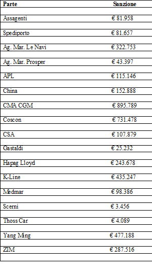 Sanzioni per oltre 4 milioni di euro per un cartello segreto messo in atto dagli agenti marittimi e dalle associazioni di categoria del settore e durato oltre 5 anni. Le ha deliberate l’Antitrust multando 15 società attive nel settore dei servizi di agenzia marittima e le due associazioni di categoria Assagenti e Spediporto, che costituiscono, rispettivamente, la principale associazione di categoria degli agenti marittimi e la più rappresentativa associazione di categoria degli spedizionieri sul territorio nazionale. E’ stata invece esentata dalla sanzione la società Maersk Italia, appartenente all’omonimo gruppo danese, che grazie alla sua domanda di clemenza e alla documentazione presentata ha permesso all’Autorità di scoprire il cartello. Ridotta del 50% la sanzione alla società Hapag Lloyd Italy che, seconda in ordine di tempo nel presentare la domanda di clemenza, ha fornito all’Autorità ulteriori documenti utili all’istruttoria.
