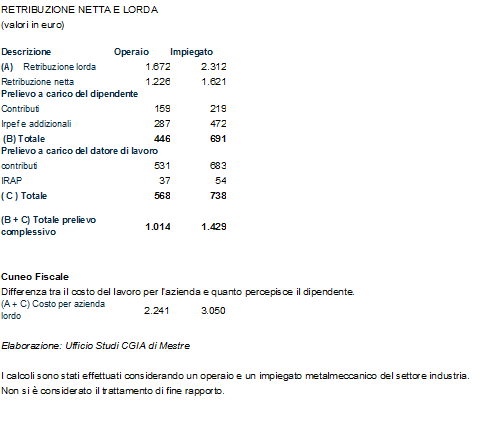 Il fisco ed i contributi previdenziali “sforbiciano” sempre più gli stipendi e salari degli italiani. Secondo un’ analisi effettuata dalla CGIA di Mestre, un operaio occupato nell’industria con uno stipendio mensile netto di 1.226 euro costa al suo titolare ben 2.241 euro. Questo ultimo importo è dato dalla somma della retribuzione lorda (1.672 euro) e dal prelievo a carico del datore di lavoro (pari a circa 568 euro).