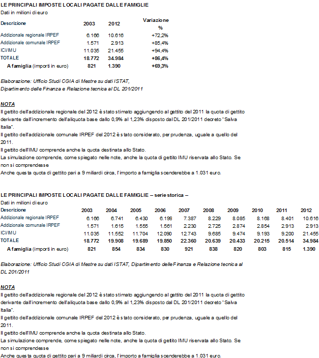 La CGIA di Mestre stima che per l’anno in corso, in particolar modo per l’applicazione dell’Imu sulla prima casa e per l’aumento delle addizionali regionali Irpef, l’impennata sarà molto decisa: su ciascuna famiglia italiana peserà un carico fiscale locale aggiuntivo medio pari a 575 euro, che alzerà la quota totale sino a toccare un valore medio di 1.390 euro.