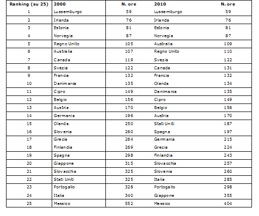 La questione dei “costi dell’adempimento” fiscale è centrale nel rapporto tra cittadini-imprese e pubblica amministrazione e ha impatti immediati e rilevanti sia in termini di lealtà fiscale sia, soprattutto, per la capacità del sistema di trasformare capitale imprenditoriale in reddito e quindi in sviluppo socio-economico. I difetti dell’infrastruttura burocratica e legale al servizio dell’imprenditorialità riducono le opportunità di business, scoraggiano la nascita di nuove imprese, frenano le potenzialità di crescita. Secondo un’analisi dell’Ufficio Studi di Confcommercio, gli oneri burocratici a carico di imprese e singoli contribuenti per adempiere agli obblighi fiscali nei confronti della pubblica amministrazione sono sempre più gravosi e complessi. Il permanere di una burocrazia fiscale impedisce l’armonico sviluppo dell’attività propria delle imprese – creare ricchezza, occupazione e benessere per i suoi stakeholder – e colloca il nostro Paese ai primi posti per la complessità burocratica degli adempimenti tributari: le ore dedicate in un anno erano 285 nel 2010, un valore elevato che pone l’Italia al 22° posto della graduatoria, molto distante da Lussemburgo, Irlanda, Estonia e Norvegia dove le ore necessarie sono meno di 100 (tab. 1).