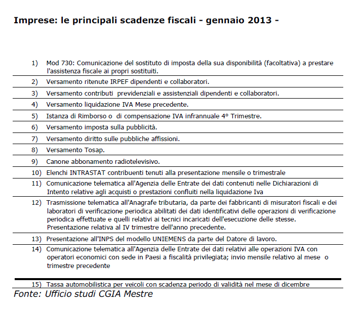 Per le partite Iva e gli imprenditori italiani sarà un inizio anno denso di scadenze fiscali. Nel mese di gennaio – segnala in una nota la CGIA – ne sono previste 15 mentre altre 16 sono in calendario per il mese di febbraio.