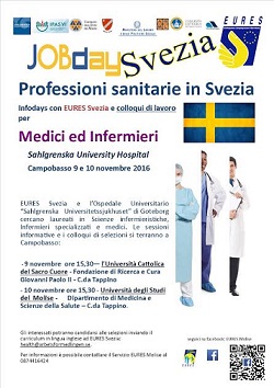 Il Servizio EURES del Molise, in collaborazione con i Servizi Pubblici per l’Impiego della Svezia e l’Ospedale Universitario Sahlgrenska di Goteeborg (Svezia), organizzano colloqui di lavoro ed infodays per Infermieri e medici.Le sessioni informative e i colloqui di lavoro si terranno a Campobasso il 9 novembre alle ore 15,30 presso l’Università Cattolica del Sacro Cuore – Fondazione di Ricerca e Cura Giovanni Paolo II – C.da Tappino e il 10 novembre ore 15,30 presso l’Università degli Studi del Molise – Dipartimento di Medicina e Scienze della Salute – C.da Tappino.