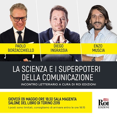 Enzo Muscia, Paolo Borzacchiello e Diego Ingrassia saranno presenti al 32° Salone Internazionale del Libro di Torino in occasione dell’evento LA SCIENZA E I SUPERPOTERI DELLA COMUNICAZIONE, promosso da ROI Edizioni. I tre autori racconteranno le loro storie e i rispettivi modelli di comunicazione: coraggio e resilienza, neuroscienze e intelligenza linguistica, consapevolezza emotiva e comportamento non verbale. L’appuntamento con Muscia, Borzacchiello e Ingrassia è per domanI 9 maggio nella Sala Magenta del Lingotto Fiere di Torino (dalle ore 18:30). L’incontro sarà mediato da Michele Riva, giornalista e amministratore delegato di ROI Edizioni.