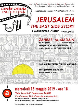 Ritorna il Cineforum Palestina! Mercoledì 15 maggio, in occasione del NAKBA day e giorno scelto dagli Stati Uniti per spostare la loro Ambasciata a Gerusalemme in violazione delle convenzioni internazionali, avrà luogo alla sala Zavattini dell’Archivio Audiovisivo del Movimento Operaio e Democratico un focus su Gerusalemme che vedrà la proiezione di due film: ZAHRAT AL MADAIN di Ali Siam (7’) filmato da Hani Jawariyah, fondatore della Palestinian Film Unit e JERUSALEM – THE EAST SIDE STORY del noto documentarista palestinese Mohammed Alatar. Alla visione delle opere seguiranno gli interventi di Raniero La Valle e Wasim Dahmash e, al termine della serata, il collegamento Skype da Ramallah con il regista.
