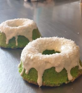 Quando le ciambelline saranno ben fredde glassiamole con del cioccolato bianco e spolveriamo con del cocco rapè