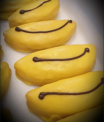 Quando sono freddi li glassiamo (per la glassa è sufficiente miscelare zucchero a velo con qualche goccia di acqua fino a raggiungere la consistenza giusta per glassare…il colorante serve solo per accentuare il colore giallo e l aroma per evidenziare ancor di più il gusto banana) aiutandoci con una forchetta e posando le banane su carta forno per far asciugare la glassa