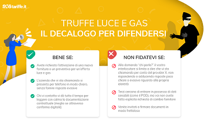 Per difendersi dalle truffe del settore energetico è necessario prestare sempre la massima attenzione a tutti i potenziali rischi. Le truffe via telefono, ad esempio, si basano sulla sottrazione dei dati personali o sulla pronuncia, da parte dell’utente, di determinate parole chiave. Le truffe “porta a porta” mirano a ad ottenere dati essenziali per l’attivazione di una nuova fornitura e prevedono che l’utente venga convinto, con l’inganno, a firmare nuovi contratti.