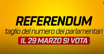 ” Il prossimo 29 marzo i cittadini italiani saranno chiamati alle urne in occasione del referendum popolare confermativo sul taglio dei parlamentari”, questo quanto stabilito dal Consiglio dei Ministri su proposta del presidente Giuseppe Conte (“Modifiche agli articoli 56, 57 e 59 della Costituzione in materia di riduzione del numero dei parlamentari”, pubblicato in Gazzetta Ufficiale lo scorso 12 ottobre 2019).