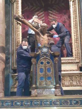 Dopo vent’anni dalla supplica di Giovanni Paolo II durante la Giornata del Perdono del 2000, torna a San Pietro il Crocifisso custodito nella chiesa di San Marcello al Corso. A Roma è conosciuto come il Crocifisso dei Miracoli perché è alla sua intercessione prodigiosa che si attribuisce la sconfitta della “Grande Peste” nel 1500 che mise in ginocchio la Capitale.