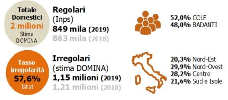 Sono 2 milioni i lavoratori domestici (6 su 10 in nero). Secondo i dati INPS 2019, i lavoratori domestici regolari sono 849 mila, in lieve calo rispetto al 2018 (-1,8%). Negli ultimi anni sono costantemente aumentate le Badanti (+11,5% dal 2012) e diminuite le Colf (-32,1%): oggi le Colf sono in lieve maggioranza (52%) rispetto alle Badanti (48%). Da fonti Istat sappiamo però che il tasso di irregolarità nel settore domestico è del 57,6%1, per cui la componente registrata all’Inps rappresenta meno della metà del totale.