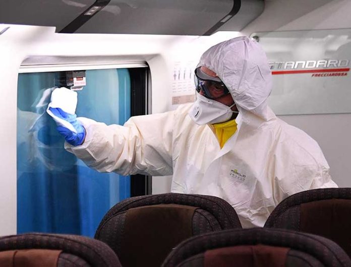 Trenitalia, per prevenire il rischio di contagio sui treni, porta a termine approfondite attività di igienizzazione e sanificazione sia prima, sia durante il viaggio. Come? Operando la pulizia di superfici e degli ambienti comuni durante le soste più lunghe dei treni in stazione, potenziando sui treni più frequentati le attività del pulitore viaggiante che interviene per igienizzare carrozze e toilette anche durante il viaggio, ricordando ai passeggeri di utilizzare il gel disinfettante per mani con dispenser installati a bordo dei treni.