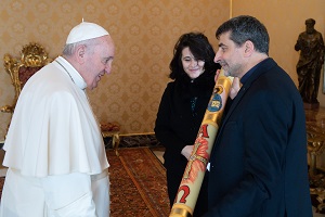 Santità, grazie per questo immenso dono che oggi ci ha fatto nell’accogliere con la Sua paterna affabilità il Direttore del carcere di Paliano e me, responsabile nazionale dei Cappellani delle carceri Italiane. Il cero che umilmente Le offriamo è stato realizzato dai detenuti del Carcere di Paliano e rientra nel progetto pastorale “La luce della libertà” che ha come obiettivo quello di donare a ogni cappella delle carceri italiane il cero pasquale dipinto dai ristretti del suddetto Istituto penitenziario. Anche questa attività lavorativa vuole aiutare il mondo recluso a non sentirsi emarginato, marchiato e giudicato da una società che a volte condanna senza misericordia.