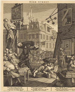 Gin Lane era inoltre anche seguita da un’altra stampa sempre di Hogarth intitolata Street Beer, che esaltava invece le virtù spensierate fuoriuscite dalle botti schiumose di birra. Street Beer raffigurava il fulcro di un’industria focalizzata su “il bel prodotto della nostra isola… il cui succo aromatico viene da noi tracannato con gioia lasciando solo l’acqua ai francesi.”