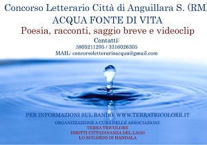Le associazioni “DIRITTI CITTADINANZA DEL LAGO”, ente di valorizzazione che opera nel territorio italiano, per la difesa dei diritti umani, a favore delle persone svantaggiate; “TERRA TRICOLORE”, agenzia media, marketing e “LO SGUARDO DI HANDALA”, Onlus che promuove rassegne cinematografiche, documentando diversi aspetti della società civile; promuovono un concorso di poesia, racconto, saggio breve e videoclip dal titolo: “Acqua fonte di vita”.