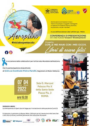 Avrà luogo il prossimo 7 aprile 2022, alle ore 15:30, presso la Sala “G. Marconi” – Palazzo Pio – della Santa Sede, la presentazione del prodotto multimediale (CD e Videoclip) come atto finale del progetto “Con le mie mani con i miei occhi – Liberi di essere felici” promosso dall’Associazione “Liberi nell’arte aps” in collaborazione con associazioni del territorio locale e nazionale. Alla conferenza che vedrà la partecipazione straordinaria del Segretario di Stato Vaticano Sua Eminenza Cardinale Pietro Parolin, interverranno autorevoli figure tra le quali il prefetto del Dicastero per la Comunicazione della Santa Sede dott. Paolo Ruffini e il prof. Stefano Vicari dell’ospedale pediatrico Bambino Gesù. Nel corso della presentazione degli artisti (interprete, autore e producer) del CD musicale – registrato in Vaticano editato da LEV con le voci corali di ragazzi e ragazze autistici – dal titolo Aeroplano #Inizialospettacolo, ci sarà la testimonianza dell’attrice Sabrina Paravicini. L’attrice racconterà la propria esperienza artistica insieme al figlio affetto da disturbo dell’autismo.