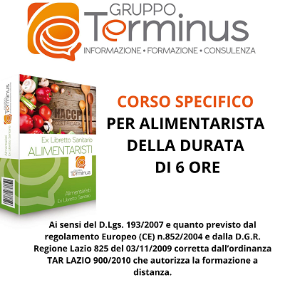 NORMATIVA: Ai sensi del D.Lgs. 193/2007 e quanto previsto dal regolamento Europeo (CE) n.852/2004 e dalla D.G.R. Regione Lazio 825 del 03/11/2009 corretta dall’ordinanza TAR LAZIO 900/2010 che autorizza la formazione a distanza.