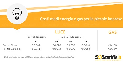 SOStariffe.it ha esaminato quali sono i costi medi unitari delle offerte energia elettrica e gas business maggiormente diffuse, confrontando il prezzo al kWh per la componente luce e a quello per m3 nel caso del gas. Le offerte luce a prezzo fisso di tipo monorario del mercato libero hanno un costo medio di 0,069 euro al kWh, mentre quelle a prezzo variabile di 0,061 euro al kWh. Nel caso di una tariffa multioraria, con fasce F1, F2 e F3, i costi sono rispettivamente pari a 0,073 euro, 0,073 euro e 0,060 euro al kWh per le offerte a prezzo fisso, mentre diventano 0,072 euro, 0,070 euro e 0,052 euro al kWh nell’ipotesi di prezzo variabile. Le offerte gas hanno un costo medio di 0,253 euro al m3 se il prezzo è fisso, mentre nel caso di prezzo variabile la cifra da sostenere è pari a 0,239 euro al m3.