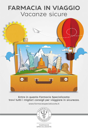 Per tutto il periodo estivo, nelle oltre 600 FARMACIE SPECIALIZZATE di Farmacisti Preparatori è attivo il servizio “Farmacia in viaggio”: consigli specifici per affrontare viaggi e vacanze in completa sicurezza, sia in base alla meta di destinazione scelta sia in base alle specifiche esigenze delle singole persone.